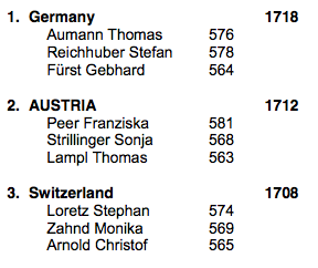 Nos 3 juniors Guillaume BONNIN (822), Elodie MEY (820, nouveau record personnel) et Antony SEGUR (815) gagnent aussi le bronze. Les jeunes croates sont loin devant avec plus de 850 de moyenne.