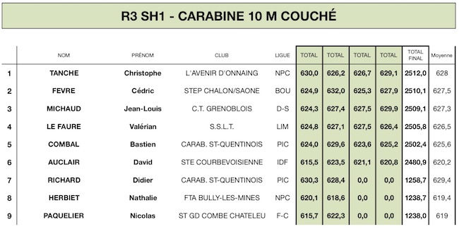 - Carabine 10 m (R3 / R4 / R5) : 4 matchs + 1 finale sur la base du 1er match