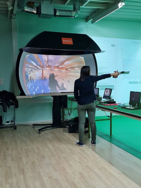 Sur un pas de tir classique, un dispositif en forme de demi-sphère entoure le tireur qui se positionne comme il le fait habituellement à l’entraînement. Le système diffuse alors les images et les sons d’une finale enregistrée lors de championnats nationaux ou nationaux et devient immersif.